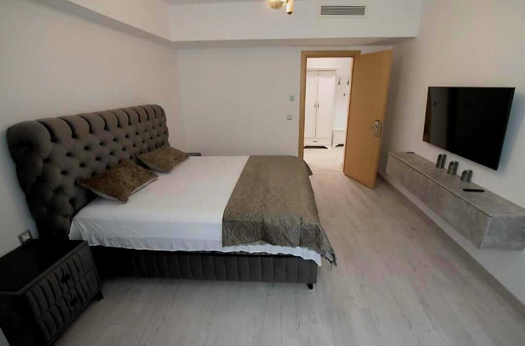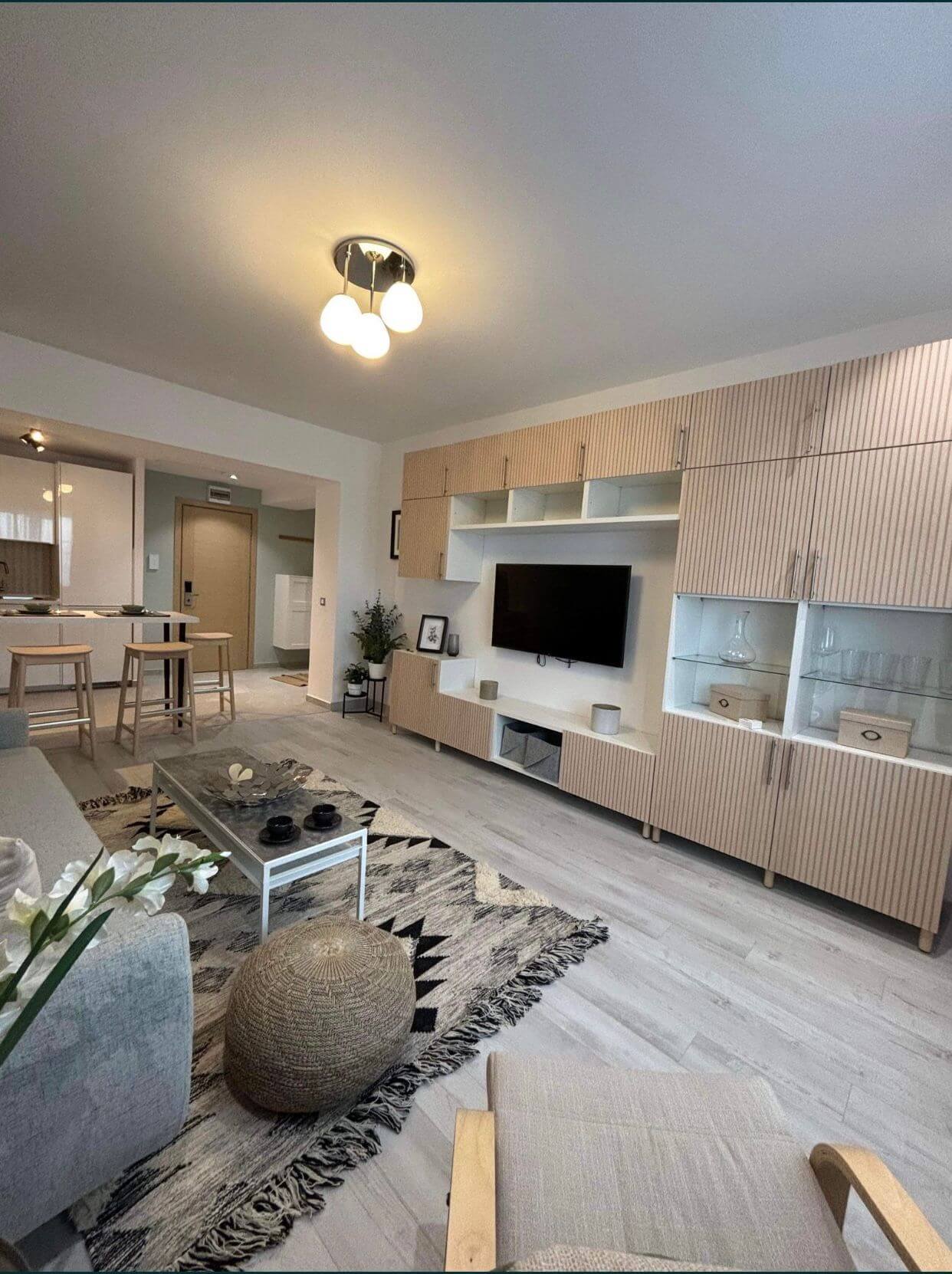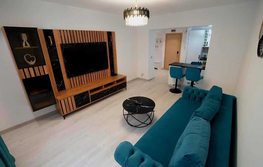 Dormitorul oferă un cadru liniștit pentru odihnă, cu pat matrimonial și mobilier modern. Livingul este spațiul perfect pentru relaxare, lucru sau socializare, fiind prevăzut cu o canapea extensibilă confortabilă și un Smart TV.