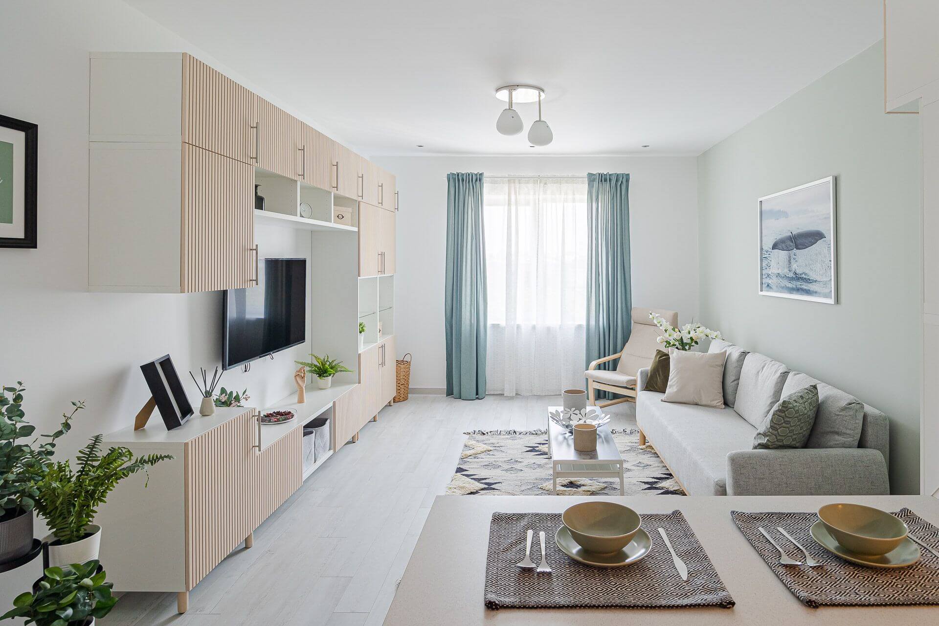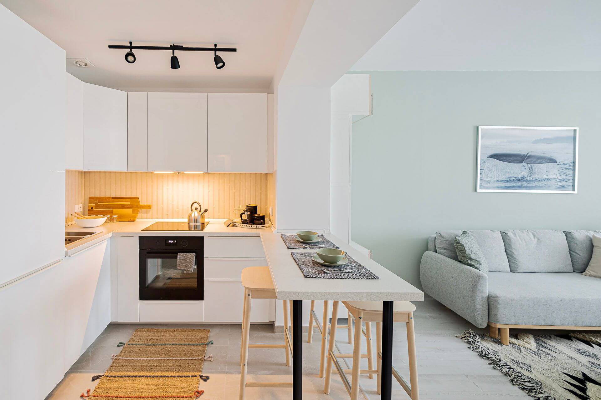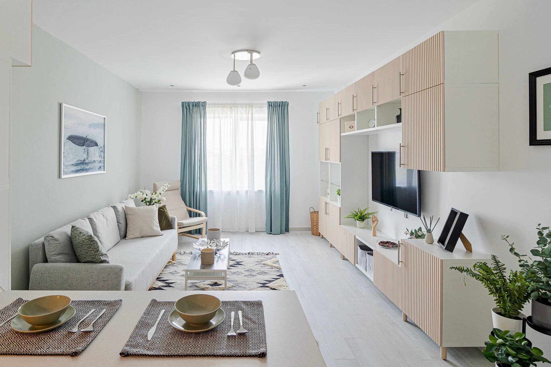 Dormitorul oferă un cadru liniștit pentru odihnă, cu pat matrimonial și mobilier modern. Livingul este spațiul perfect pentru relaxare, lucru sau socializare, fiind prevăzut cu o canapea extensibilă confortabilă și un Smart TV.