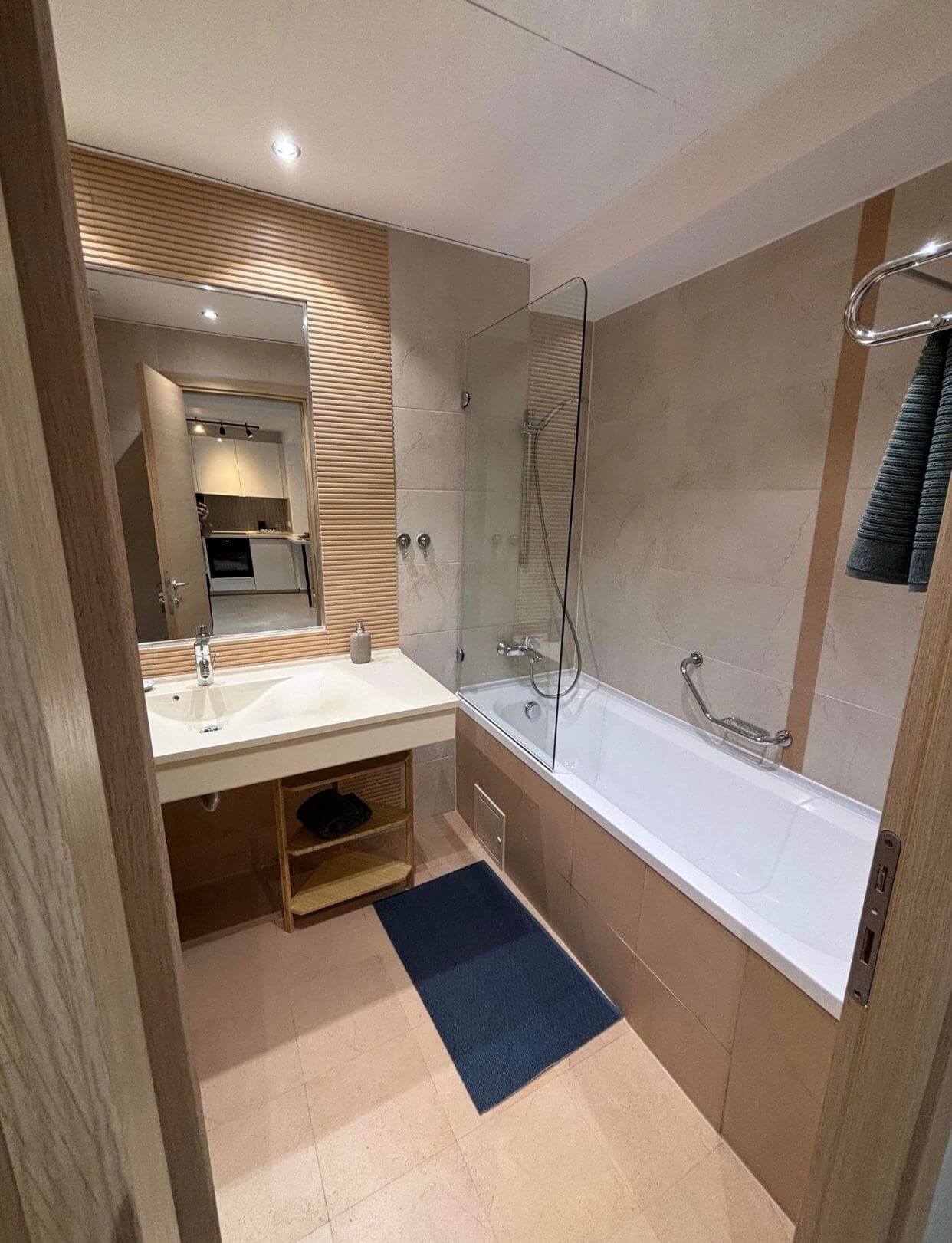 Bucătăria este complet utilată și permite oaspeților să gătească oricând doresc. Veți găsi aici frigider, cuptor cu microunde, plită electrică, veselă completă și toate ustensilele necesare. Baia, generoasă ca spațiu, este dotată cu cadă, uscător de păr și produse de igienă personală incluse.