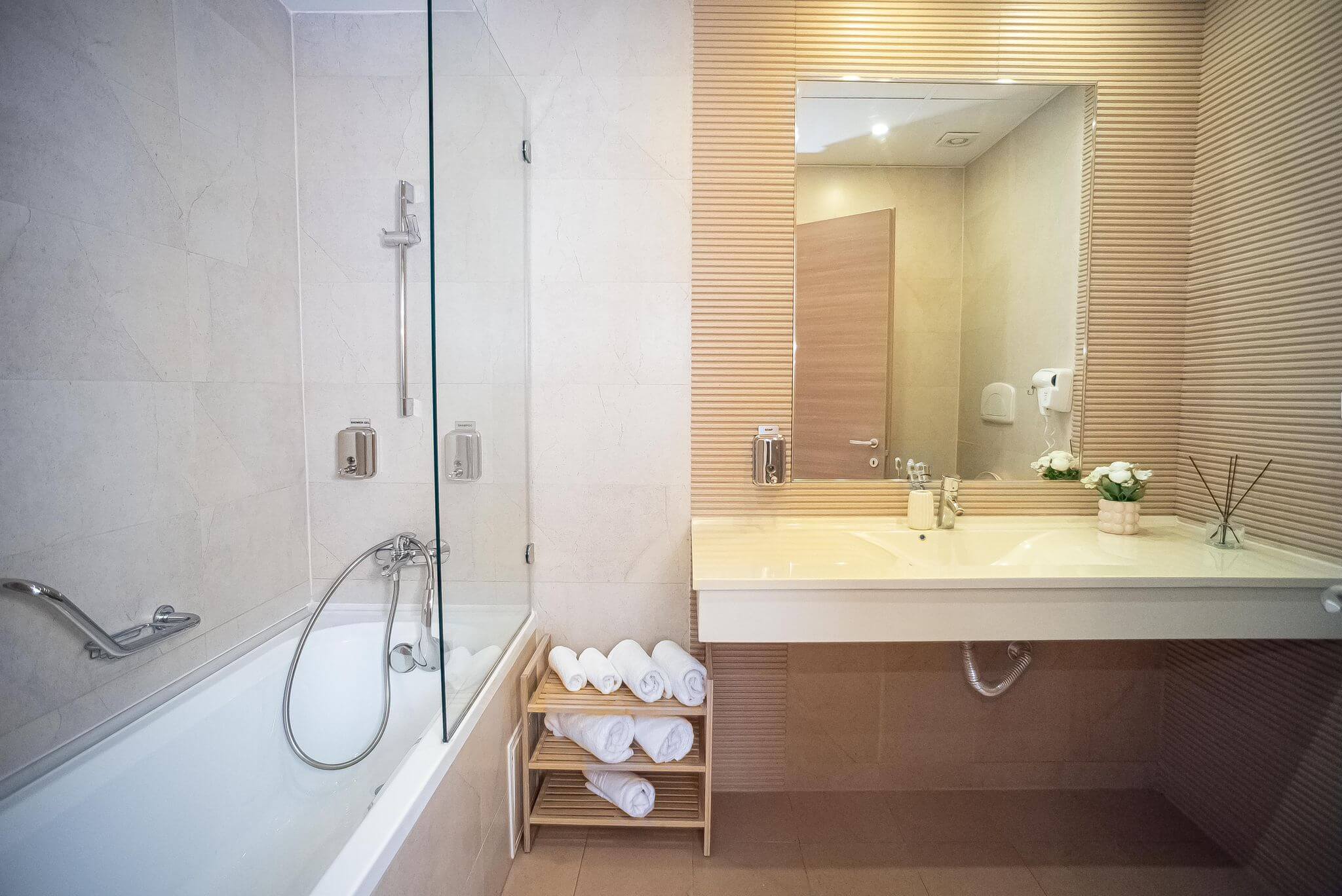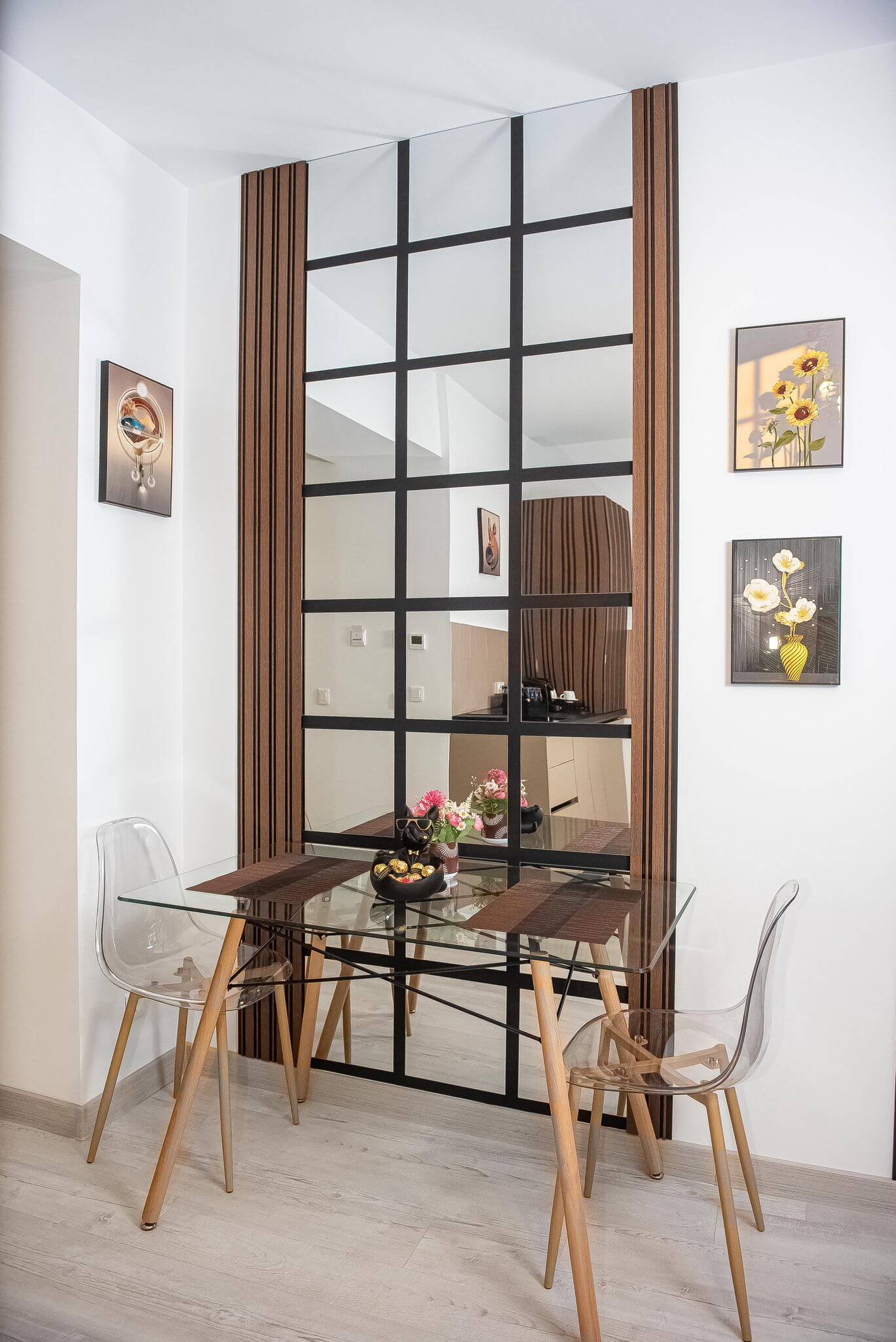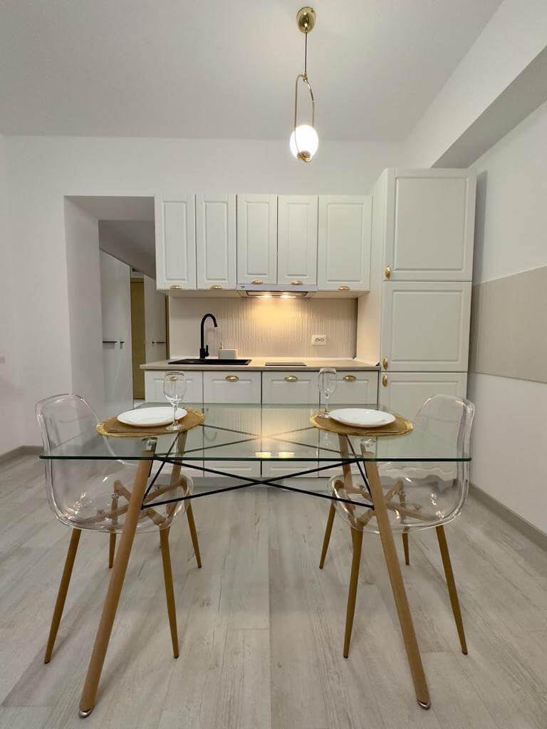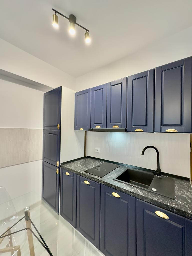 Interiorul studioului este atent amenajat, într-un stil contemporan, cu finisaje de calitate superioară și mobilier ergonomic. Dormitorul dispune de un pat matrimonial generos, cu saltea ortopedică și lenjerii premium, iar bucătăria deschisă este complet utilată – ideală pentru a pregăti micul dejun sau o cină relaxantă, ca acasă. Baia este spațioasă, dotată cu cadă, uscător de păr și produse de îngrijire personală gratuite.